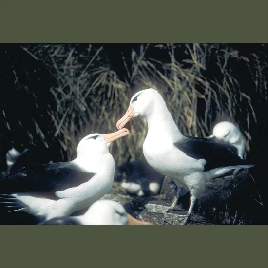 Smaller macaroni, royal, and rockhopper penguins breed in huge summer colonies—5.4 million pairs at South Georgia, 2.2 million at Iles Crozet, 1.8 million at Iles Kergeulen, and two million at Heard and McDonald Islands. One million rockhopper pairs are on the Falkland Islands. Royals are only on Macquarie Island. All three have special hopping and jumping abilities enabling them to breed among tumbled boulders on exposed shores. They pursue lantern fish and small luminescent euphausiid crustaceans for food.