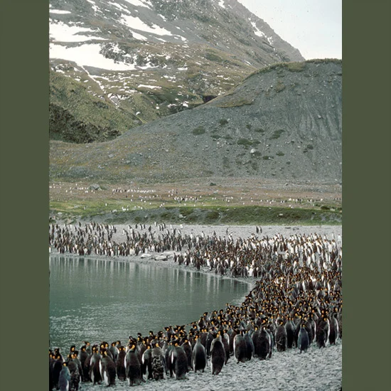 Slightly larger gentoos with orange bills and conspicuous white eye patches prefer flatter terrain near water, handy for families which take longer to fledge. Gentoo reproductive seasons stretch out over 120–145 days, hard on parents but good for chicks which start out better able to deal with life’s adversities. An estimated 300,000 gentoo pairs gather on subantarctic islands and the Peninsula—colonies of some 100,000 pairs at South Georgia, 70,000 on the Falkland Islands, 30,000 on Iles Kerguelen.