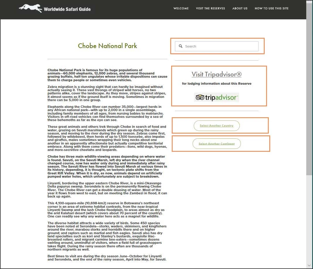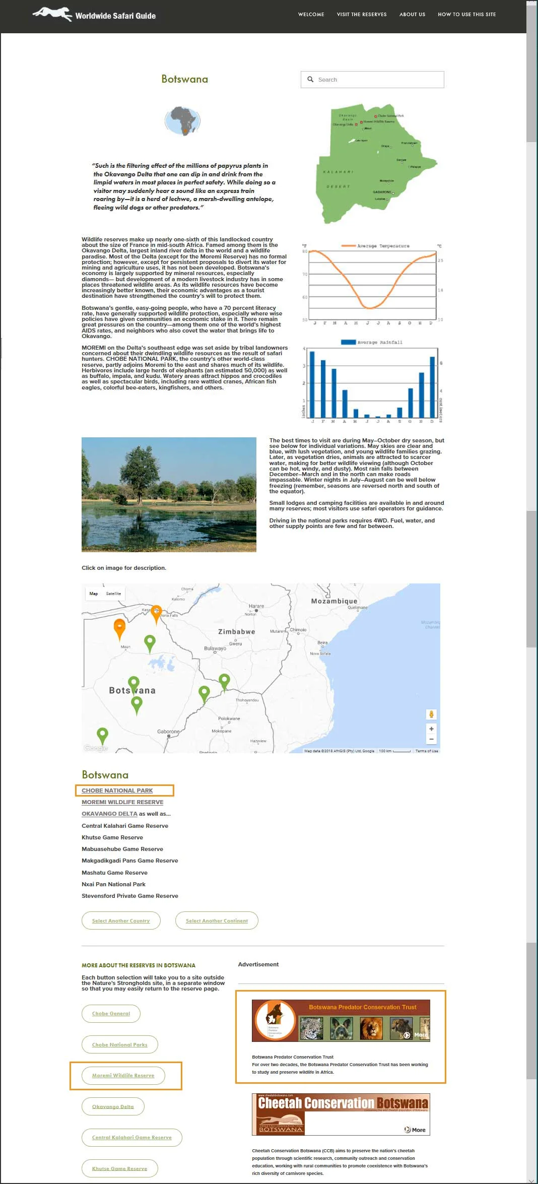 Then, if you want to learn more about a specific reserve in Botswana, as "Chobe", link down one further level to the page having to do with that reserve.