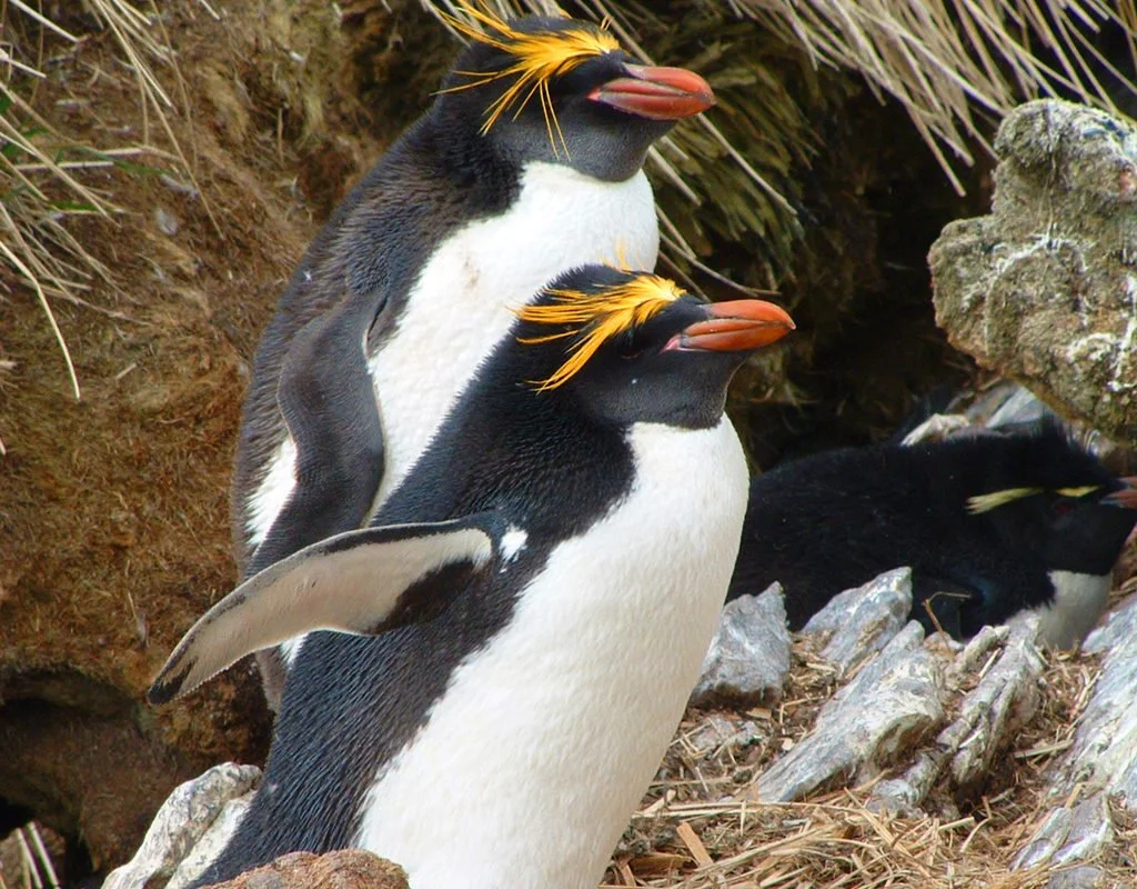 The Macaroni Penguin is a crested penguin similar to the Rockhopper. Like the Rockhopper it is migratory arriving in the Islands each summer to breed. Macaroni penguins are slightly larger than the rockhopper penguin with distinctive golden orange head plumes which spread out and back from the forehead. It has a prominent pink patch at the gape. Head, throat and back are blue-black and under parts white. The very stout bill is orange-red and feet pink.