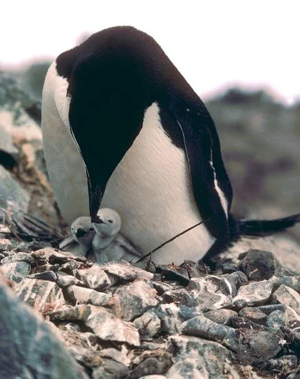 Chinstraps, - Pygoscelis antarcticus named for distinctive black neck feathers, often seen standing about on ice floes, like to forage among pack ice. Smaller than either gentoos or Adelies, they pick the highest, rockiest, most inaccessible nest sites, pulling themselves up flipper by flipper around the Peninsula and on islands south of the Antarctic Polar Front. An estimated five million of them nest on little-visited South Sandwich Islands.