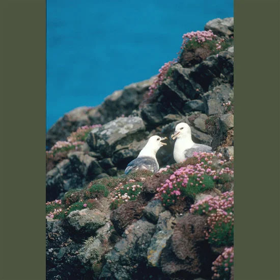 Fulmars, most abundant species, look out mildly from precariously balanced grassy overhangs— six feet (2 m) is diving limit of these plump little birds.