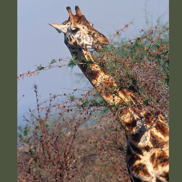 Dainty goat-like klipspringers bound over rocky outcrops on tiny rubbery hooves which cling to the steepest incline, getting what water they need from succulent forage. So do gerenuks, standing on hind legs to get leaves unavailable to others. Fringe-eared oryx, which can regulate their body temperature, are also present.