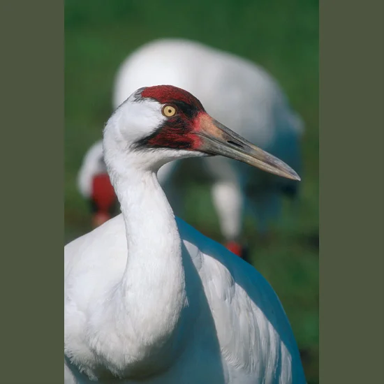 He instantly recognized the glistening scarlet-crowned pair of snow-white birds and their chick. Once seen, they are unforgettable—five feet (1.6 m) high, North America’s tallest bird, with wingspreads up to eight feet (2.6 m)—unchanged since they evolved with the saber-toothed cat. Their bugling cry from yard-long (1 m) windpipes can be heard for miles. Formerly they nested across the continent. A number of factors, some natural, some human-caused, reduced their numbers to 15 in 1941 and scientists predicted their imminent extinction. But with protection here and elsewhere, on their Texas gulf coast wintering grounds and along their peril-fraught 2,500-mile (4,300-km) migration route, there are now more than 400 including 40 breeding pairs, and the outlook is more encouraging.